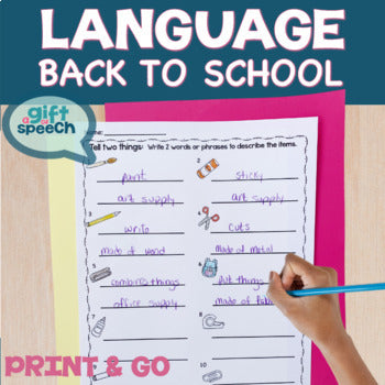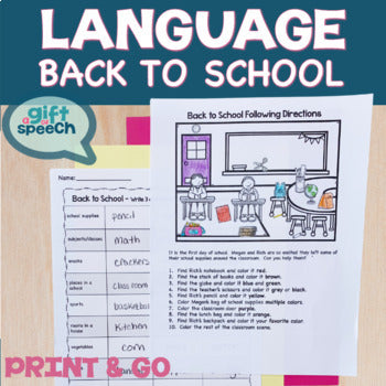 Get ready for Back to School with these NO PREP language activities. Full of print and go pages to target vocabulary, language development, antonyms, answering wh questions, prepositions, categories, verbs, plurals, and more.