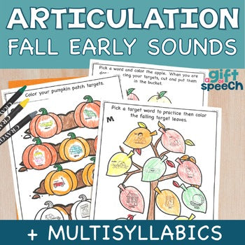 Fall into these no prep articulation activities for early developing sounds and multisyllabic words (3 syllable). This Fall print and go resource includes 4 practice pages per speech sound and position There are also 40 multisyllabic words (3 syllables) included in the Autumn resource. Use this activity with your in-person groups or online.