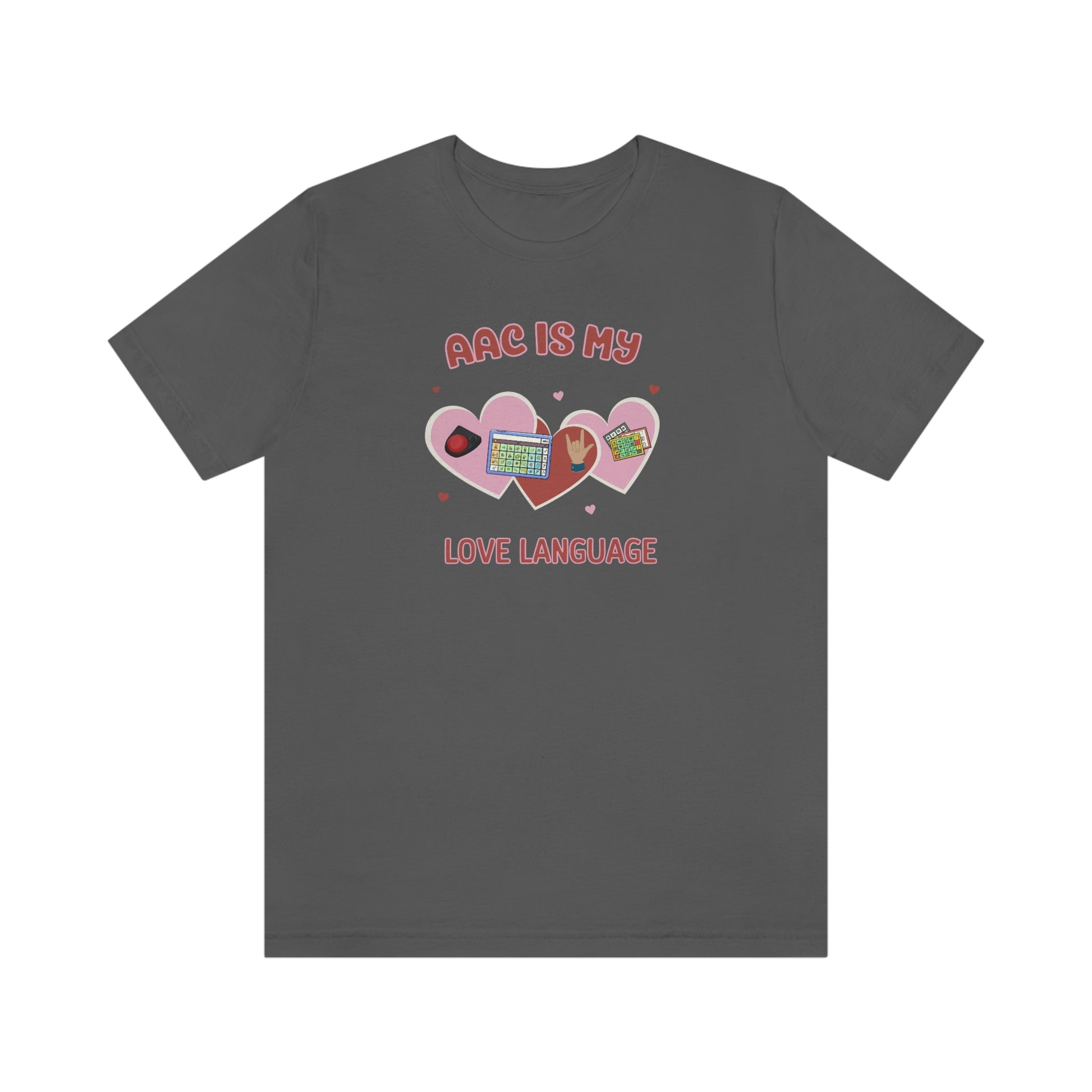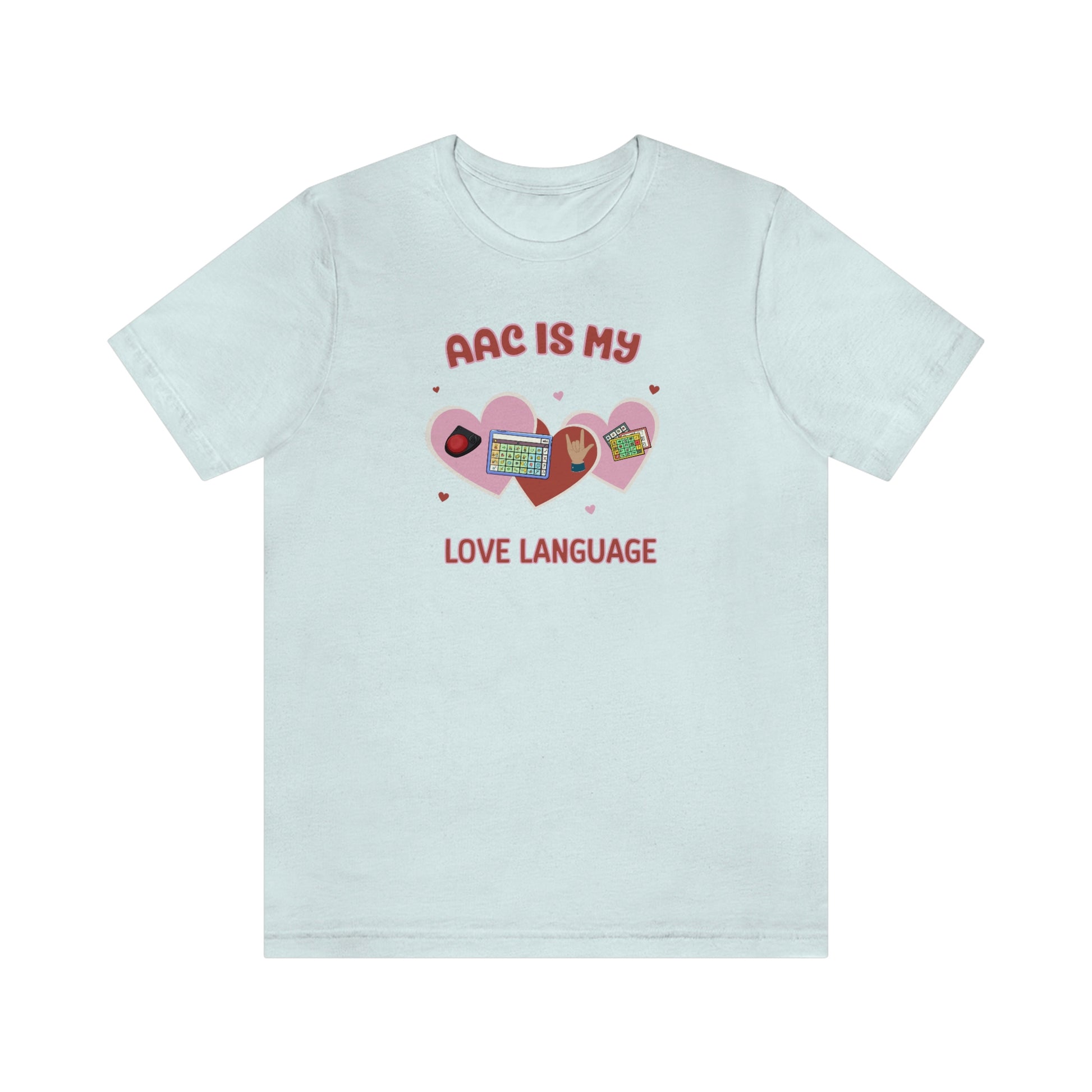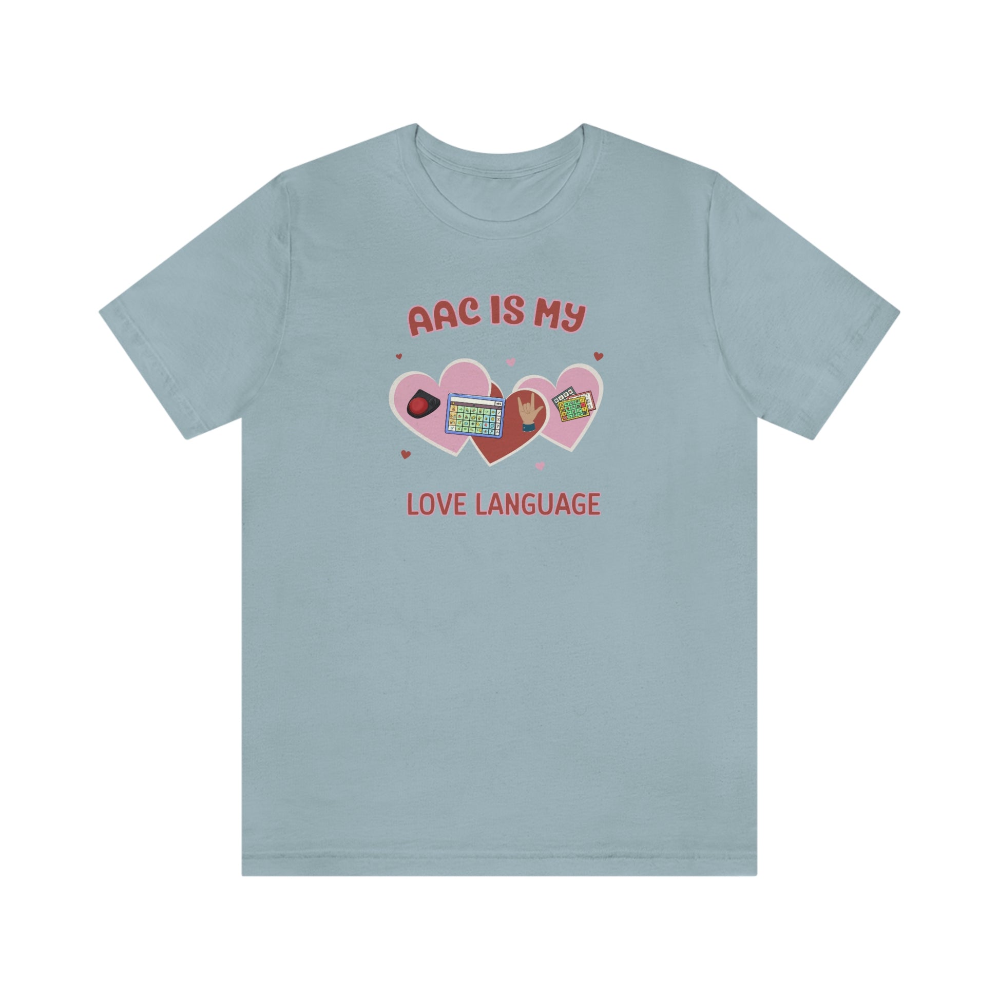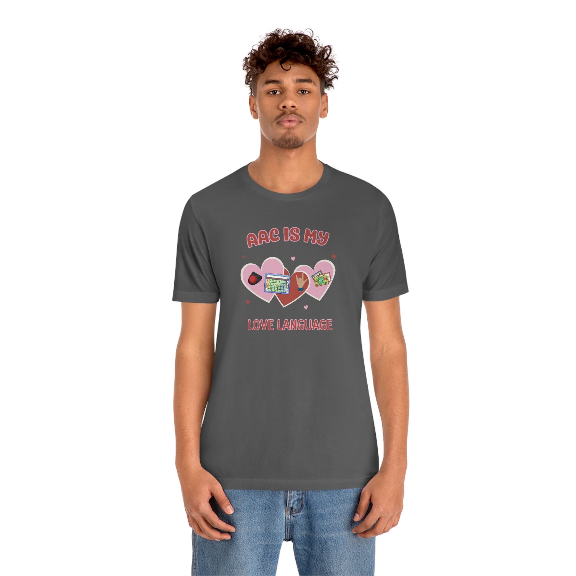 AAC is My Love Language Tee a Valentine's Day shirt for the SLP, SLPA, Educator, Family, and Communication Champion. The perfect AAC t-shirt for the speech therapist and AAC champions. This classic unisex jersey short sleeve tee fits like a well-loved favorite. Soft cotton and quality print make users fall in love with it over and over again. These t-shirts have-ribbed knit collars to bolster shaping. The shoulders have taping for better fit over time. Dual side seams hold the garment's shape for longer.
