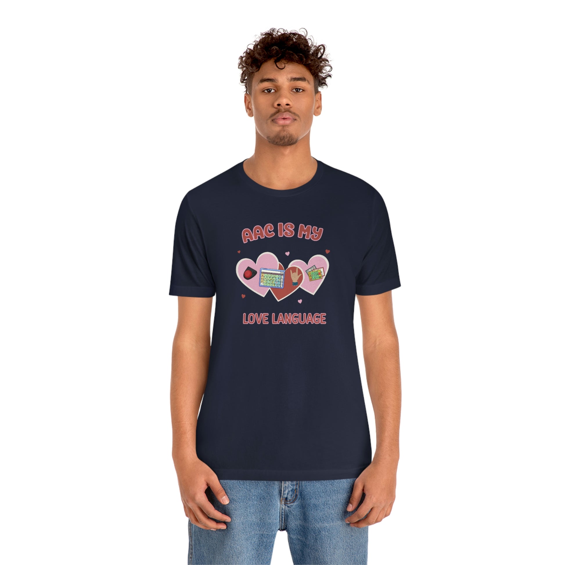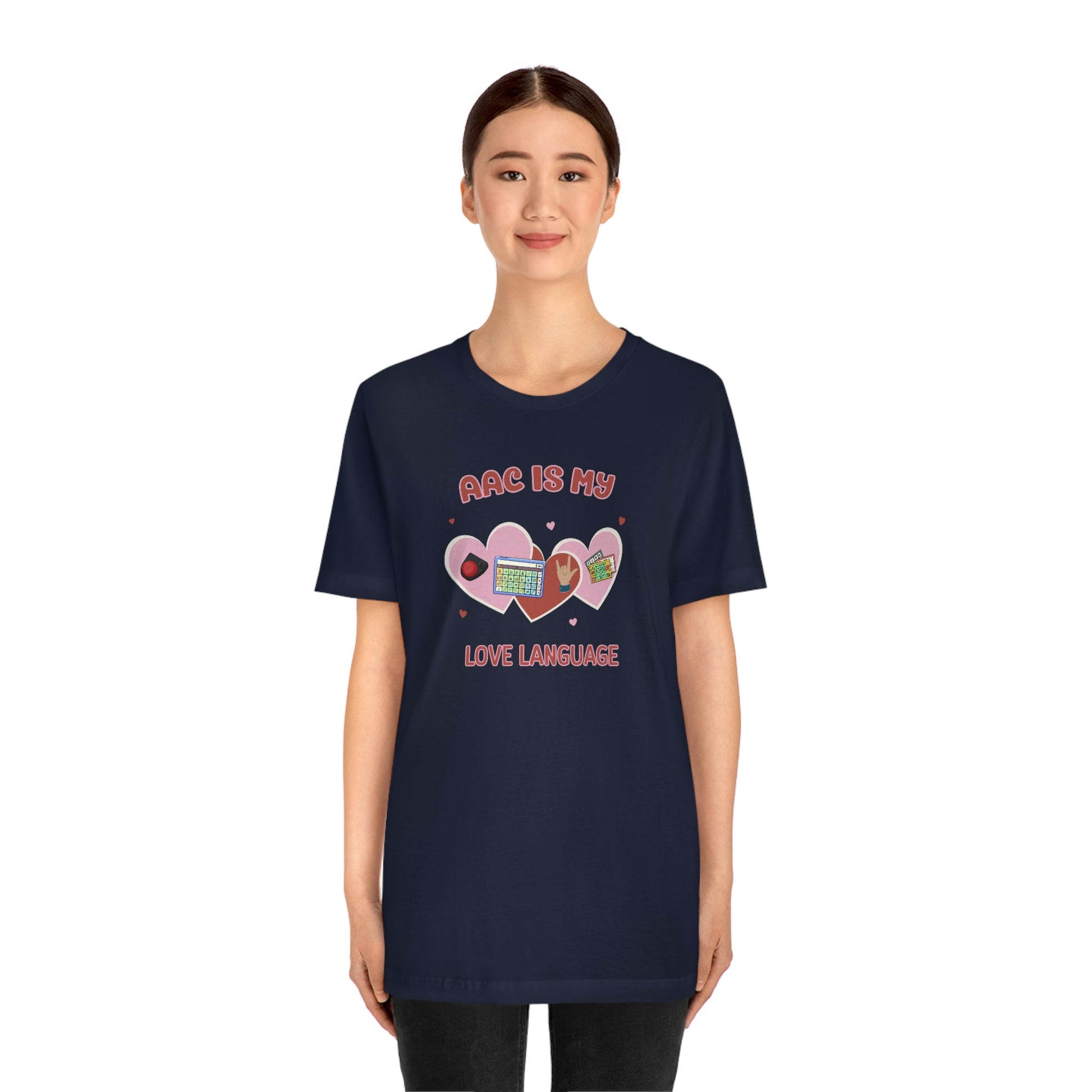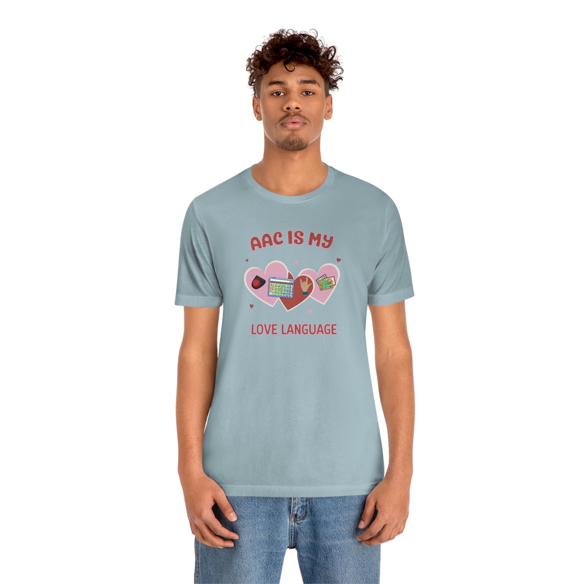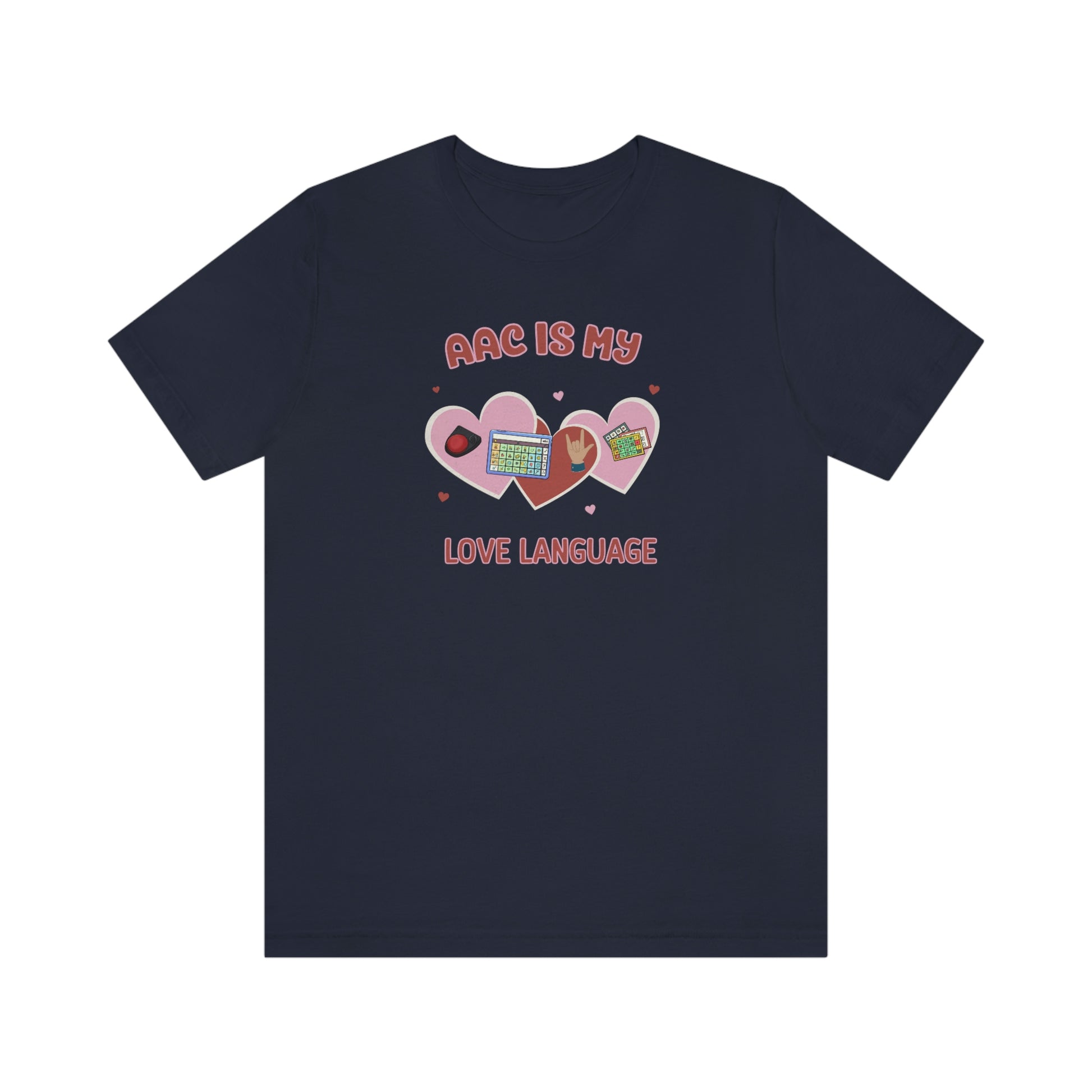 AAC is My Love Language Tee a Valentine's Day shirt for the SLP, SLPA, Educator, Family, and Communication Champion. The perfect AAC t-shirt for the speech therapist and AAC champions. This classic unisex jersey short sleeve tee fits like a well-loved favorite. Soft cotton and quality print make users fall in love with it over and over again. These t-shirts have-ribbed knit collars to bolster shaping. The shoulders have taping for better fit over time. Dual side seams hold the garment's shape for longer.
