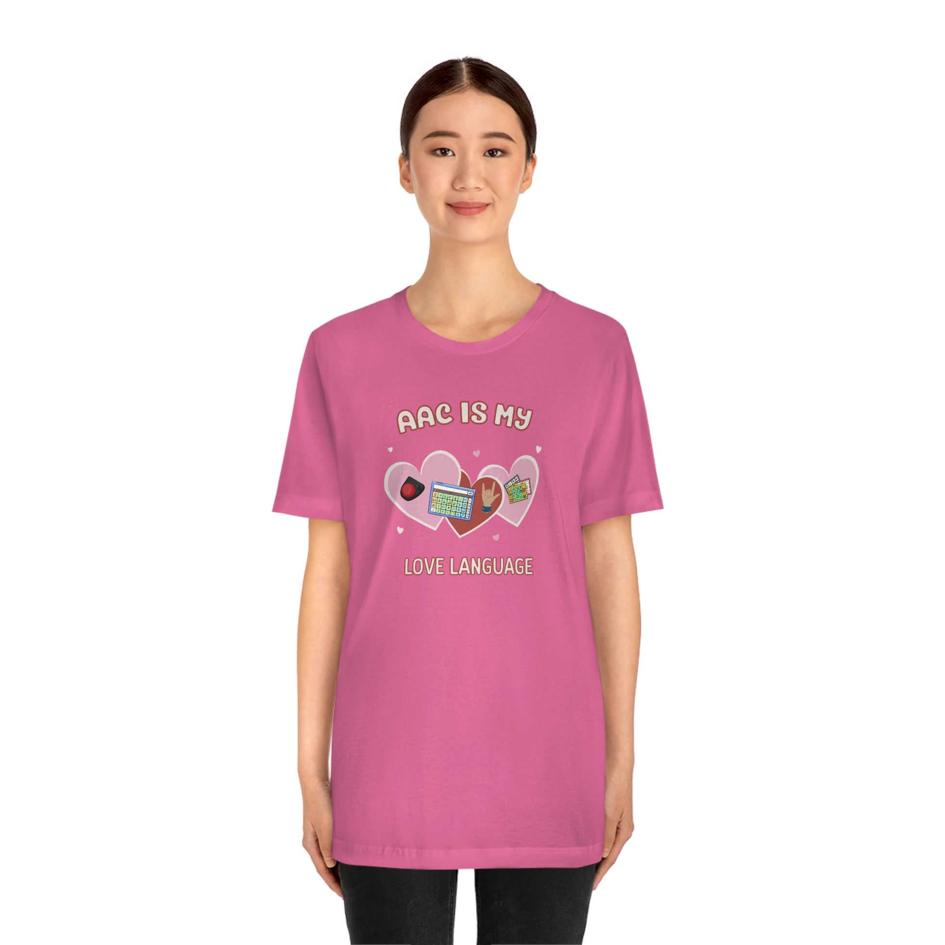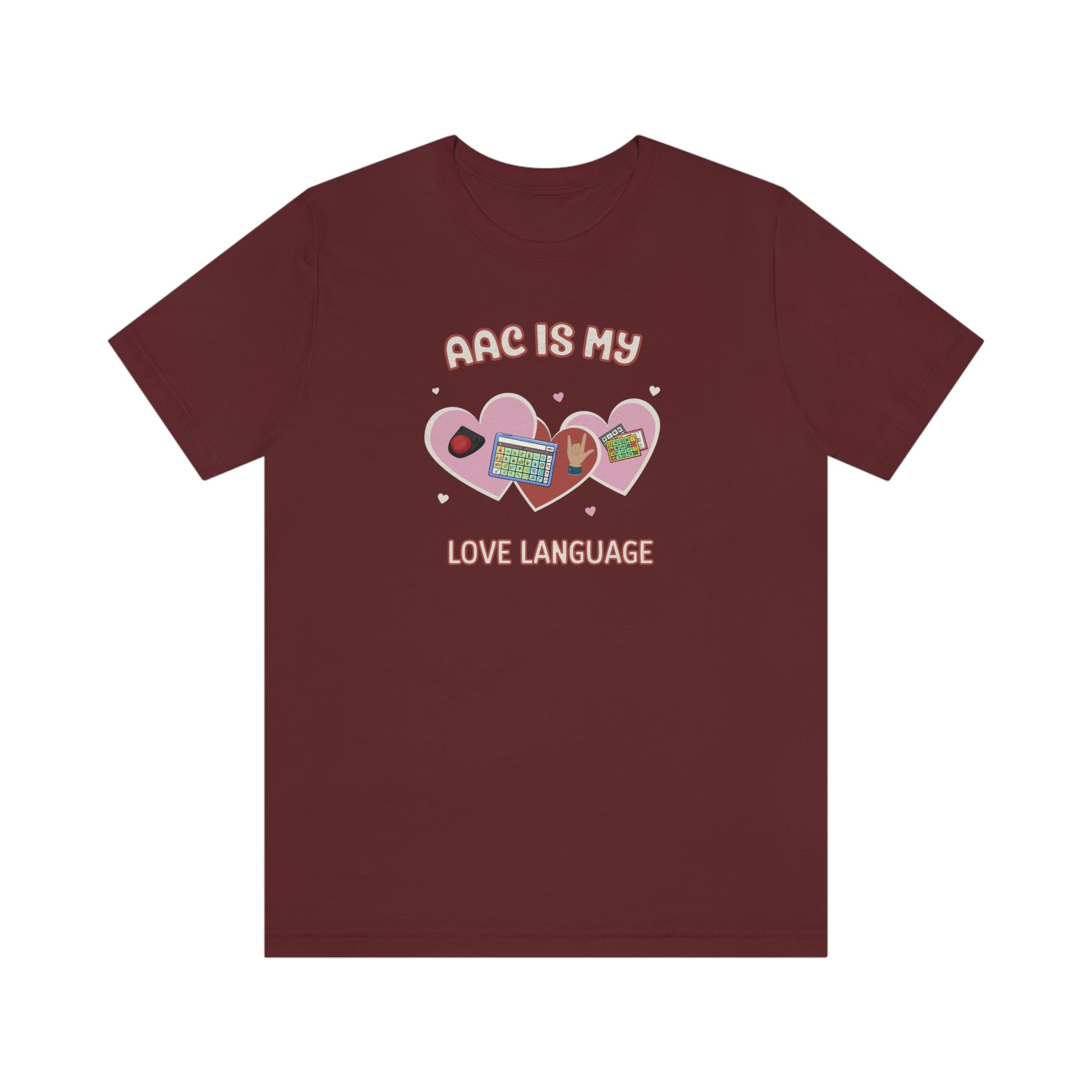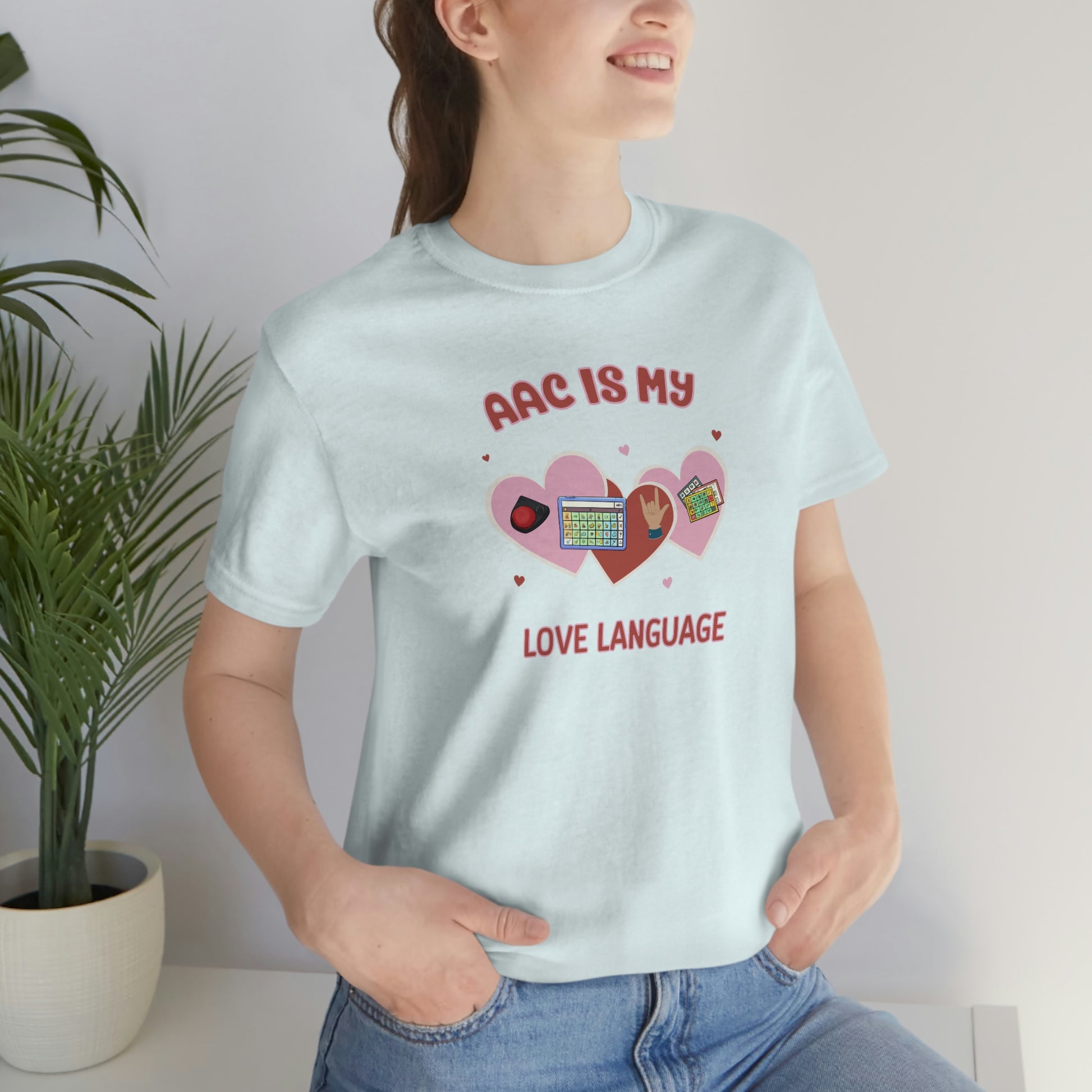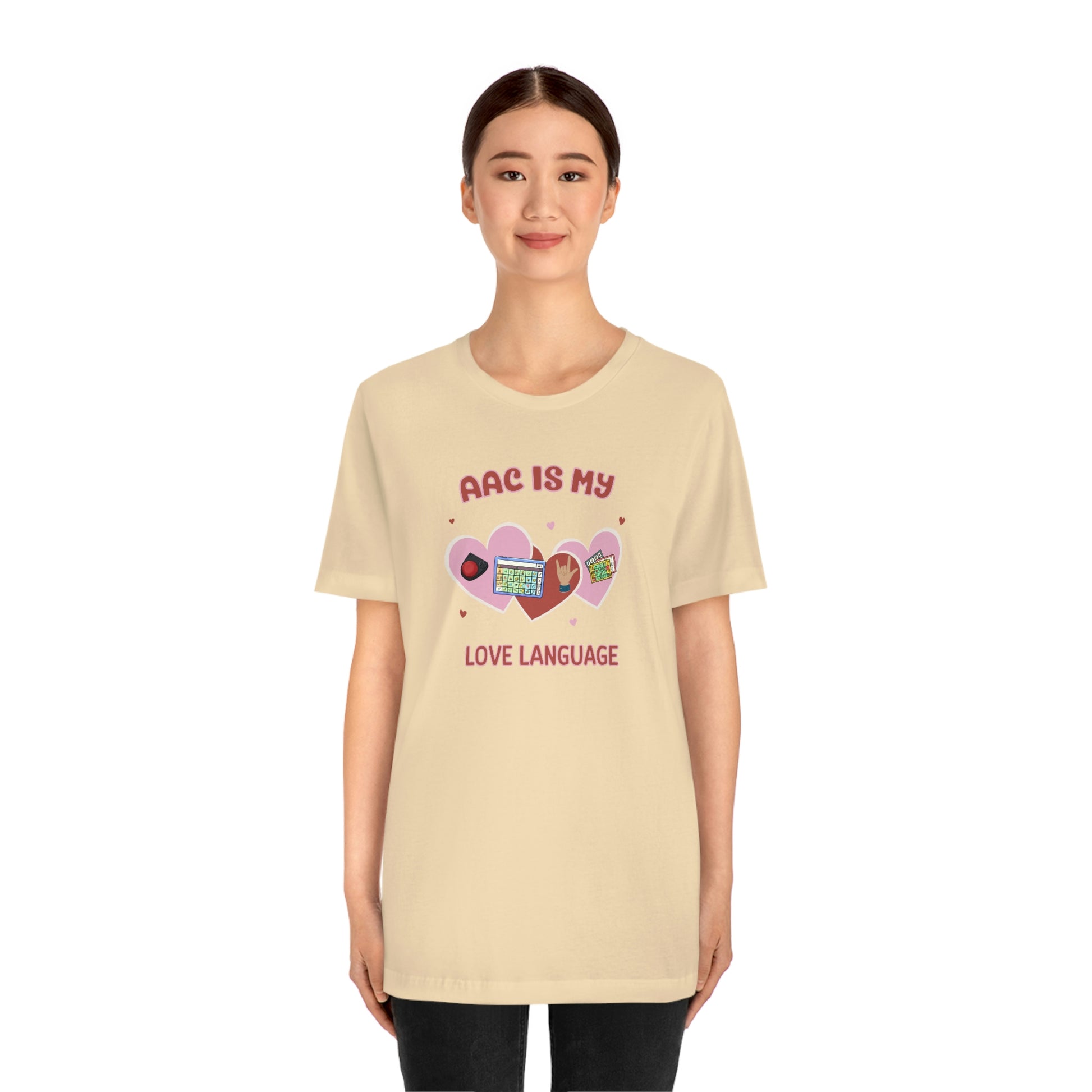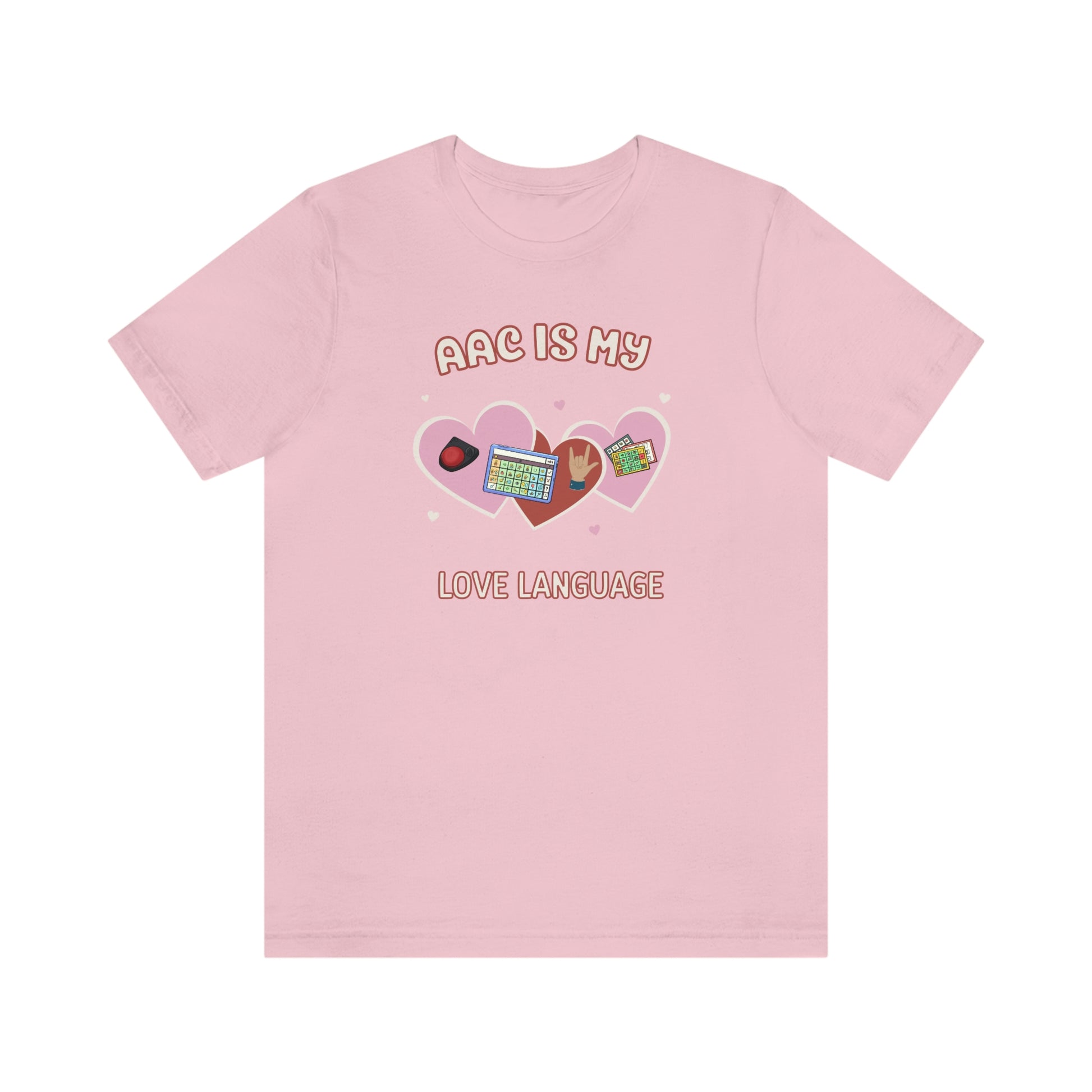 AAC is My Love Language Tee a Valentine's Day shirt for the SLP, SLPA, Educator, Family, and Communication Champion. The perfect AAC t-shirt for the speech therapist and AAC champions. This classic unisex jersey short sleeve tee fits like a well-loved favorite. Soft cotton and quality print make users fall in love with it over and over again. These t-shirts have-ribbed knit collars to bolster shaping. The shoulders have taping for better fit over time. Dual side seams hold the garment's shape for longer.