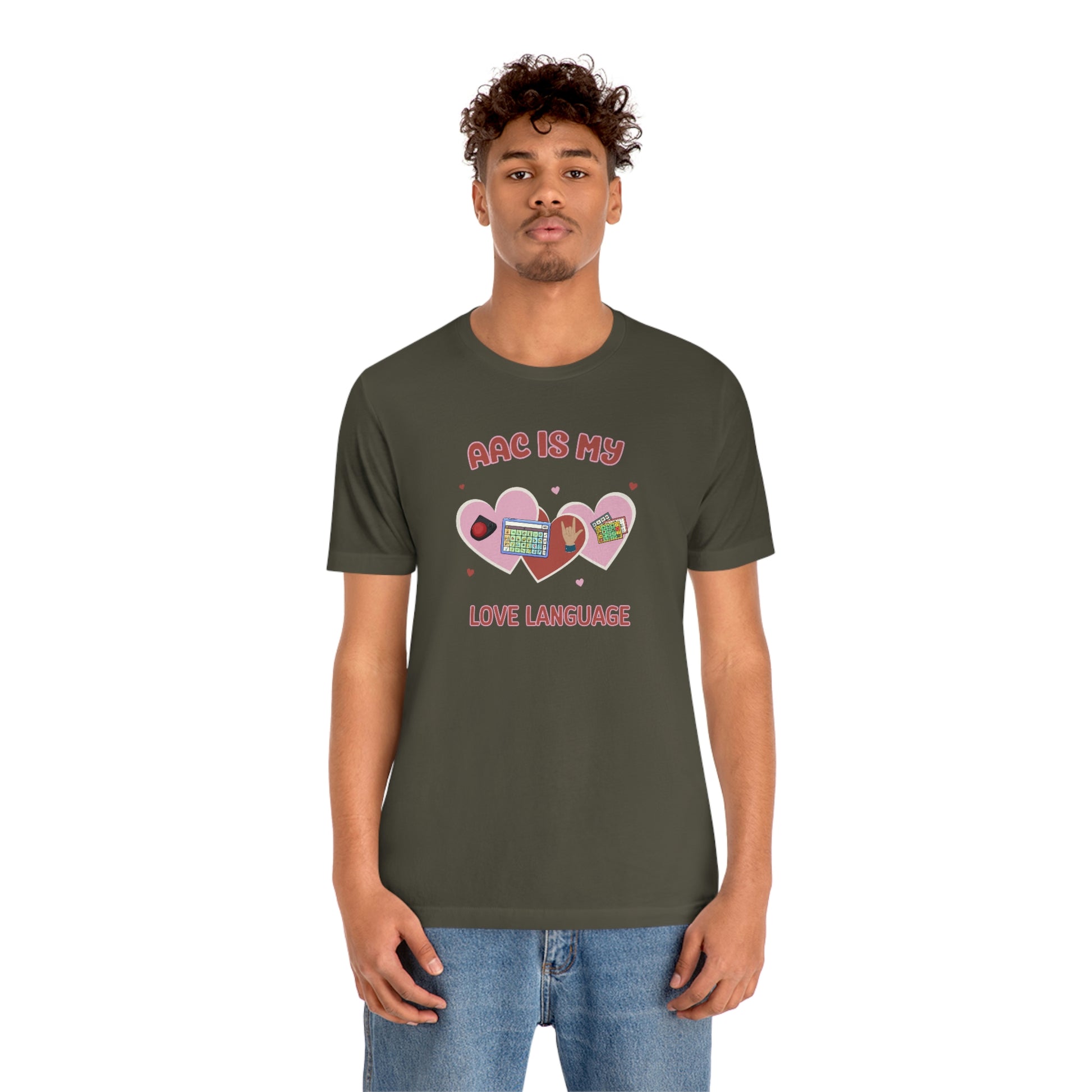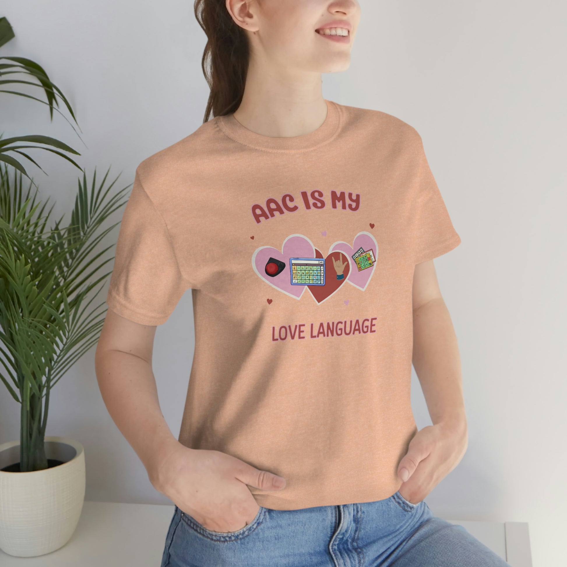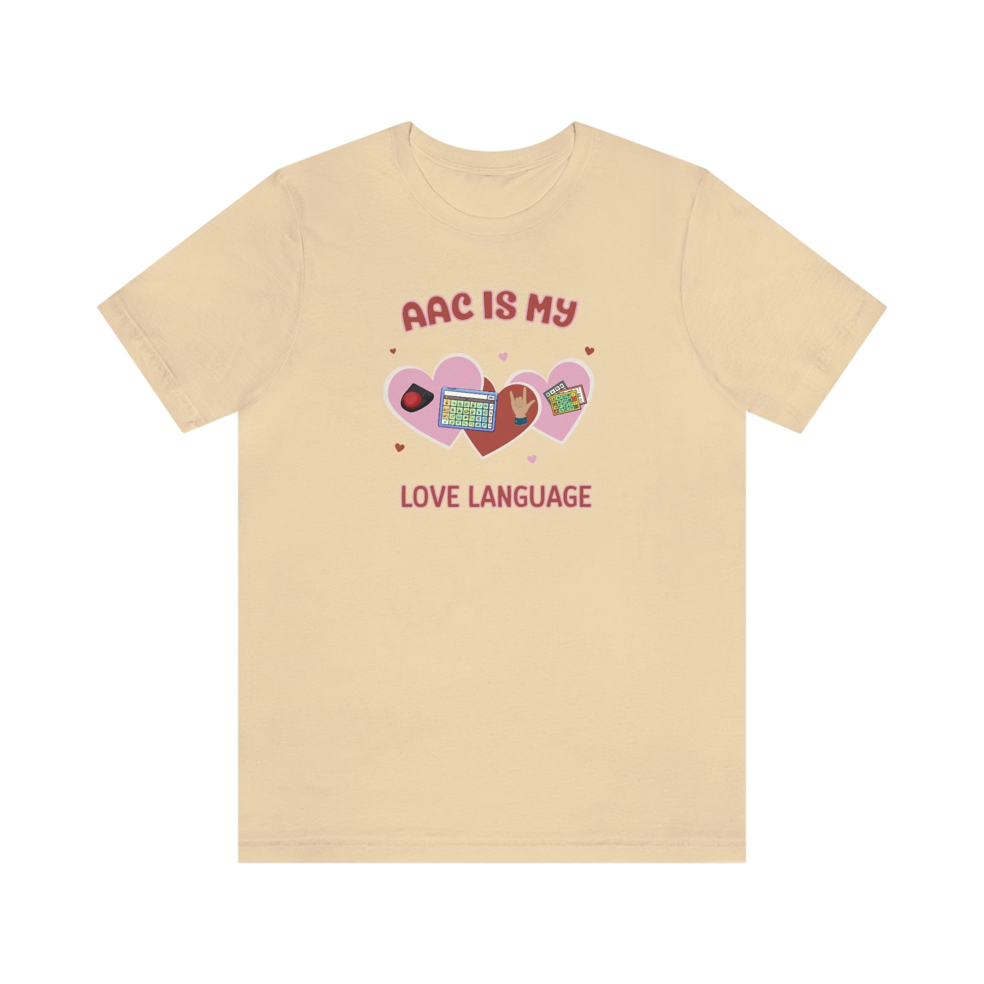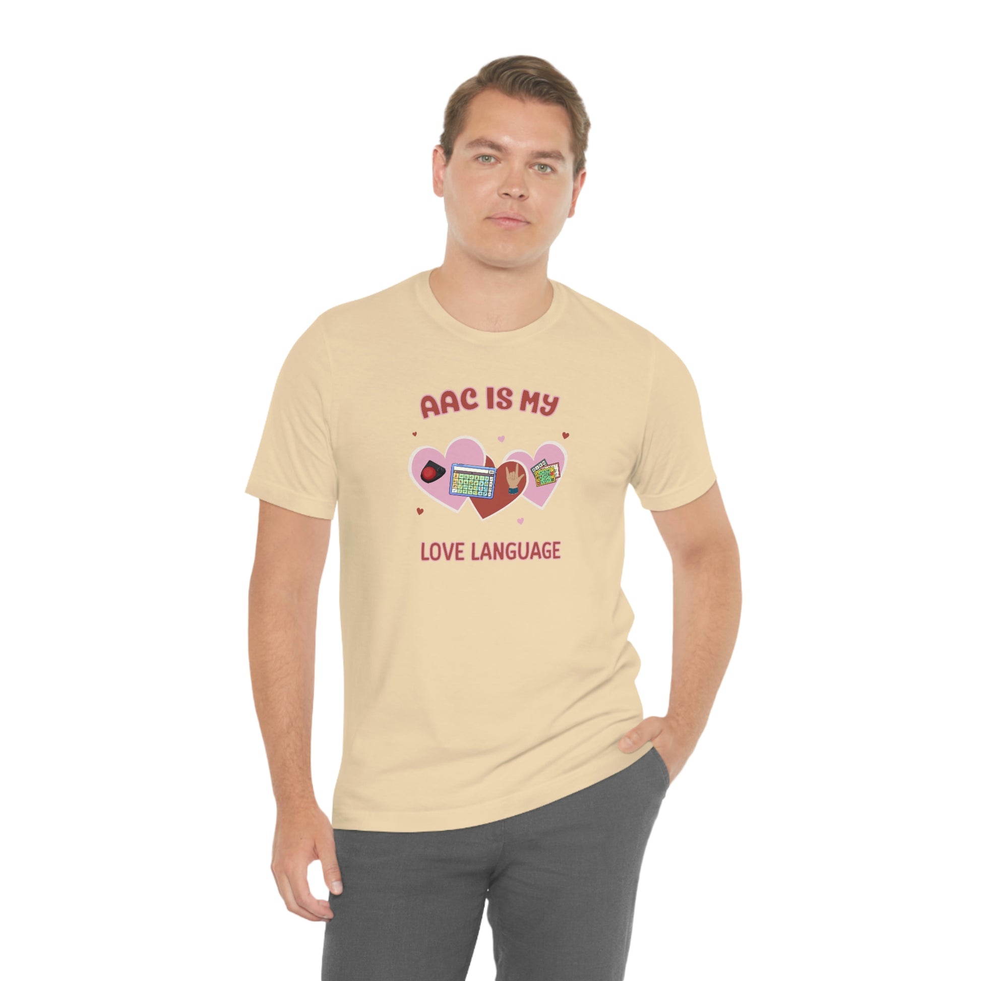 AAC is My Love Language Tee a Valentine's Day shirt for the SLP, SLPA, Educator, Family, and Communication Champion. The perfect AAC t-shirt for the speech therapist and AAC champions. This classic unisex jersey short sleeve tee fits like a well-loved favorite. Soft cotton and quality print make users fall in love with it over and over again. These t-shirts have-ribbed knit collars to bolster shaping. The shoulders have taping for better fit over time. Dual side seams hold the garment's shape for longer.
