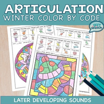 Stay warm with this cozy ready to go Winter NO PREP articulation color by number for later developing sounds. This NO PREP articulation color by code resource includes 4 practice pages per speech sound and position (12 per phoneme). Your students will enjoy the Winter coloring tasks while you are able to quickly and effectively address goals.
